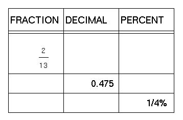 5. Complete the below table. Fractions do not have to be expressed in lowest terms. Decimals should be to 4 places. ( 3 points per blank.)